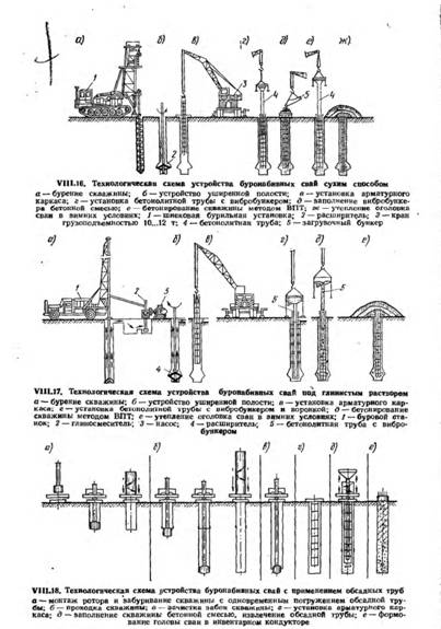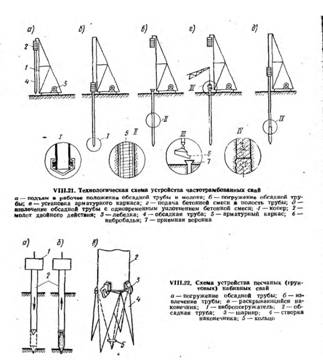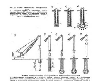 Затем бурят следующий участок скважины, после чего наращивают и погружают в скважину очередную секцию обсадной трубы. Эти операции повторяют до окончания бурения скважины на проектную отметку. После зачистки забоя и установки в скважине арматурного каркаса скважину бетонируют методом ВПТ. По мере заполнения скважины бетонной смесью инвентарную обсадную трубу извлекают. При этом специальная система домкратов, смонтированных на установке, сообщает обсадной трубе возвратно-поступательное и полувращательное движение, дополнительно уплотняя бетонную смесь. По окончании бетонирования скважины голову сваи формуют в специальном инвентарном кондукторе. Для устройства уширения в основаниях свай, как правило, применяют взрывной способ. для этого (рис. УIII. 19) в пробуренной скважине устанавливают обсадную трубу так, чтобы ее нижний конец не доходил до дна скважины на 1,2...1,5 м, т. е был за пределами действия камуфлетного взрыва. В обсадную трубу опускают на дно скважины заряд взрывчатки расчетной массы и выводят проводники от детонатора к подрывной машине. Трубу заполняют бетонной смесью и производят взрыв. Энергия взрыва уплотняет грунт и создает сферическую полость, которая немедленно заполняется бетонной смесью из обсадной трубы. Окончательно заполняют скважину описанным выше способом. В СССР буронабивные сван изготовляют диаметром 880...1200мм, длиной до 35 м. для устройства буронабивнмх свай используют литую бетонную смесь с осадкой конуса 1б...20 см. Пневмонабивные сваи применяют при устройстве свайных фундаментов в грунтах с большим притоком воды, затрудняющим сооружение буронабивных свай. В этом случае бетонную смесь укладывают в полость обсадной трубы при постоянном повышенном давлении воздуха (0,25...0,3 МПа), который подается от компрессора через ресивер. Бетонную смесь подают небольшими порциями через специальное устройство — шлюзовую камеру, действующую по принципу пневмонагнетательных установок, применяемых для транспортирования бетонной смеси. Шлюзовые камеры состоят из двух отрезков труб, соединенных фланцами, которые имеют верхние и нижние отверстия, закрываемые клапанами. При подаче смеси через воронку в верхнюю камеру закрыт ее нижний клапан; после подачи порции верхний клапан верхней камеры закрывается, а нижний открывается и т. д. В целях экономии сжатого воздуха применяют герметизированные бетоносмесителя. Армируют пневмонабивные сваи путем погружения стержней арматуры в свежий бетон. Вибротрамбованные сваи (рис. УIII. 20) используют в сухих связных грунтах, в которых можно укладывать бетонную смесь в открытую скважину глубиной 4...6 м. Такие сваи устраивают следующим образом. В грунт с помощью вибропогружателя, подвешенного к экскаватору погружают стальную обсадную трубу, имеющую на конце съемный железобетонный башмак. После погружения трубы вибропогружатель снимают и внутреннюю полость трубы заполняют на 0,8... 1 м бетонкой смесью. С помощью трамбующей штанги, подведенной к вибропогружателю, смесь трамбуют, в результате чего она вместе с башмаком вдавливается в грунт, образуя при этом уширенную пяту. Заполнив бетонной смесью обсадную трубу, ее извлекают из грунта с помощью — экскаватора при работающем вибропогружателе. После извлечения трубы устанавливают арматурный каркас для связи головы сваи с желе