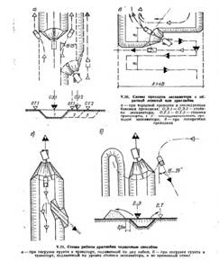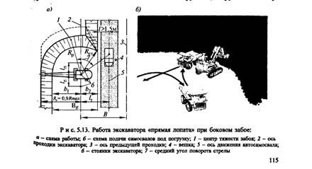 Более эффективным является разработка грунта боковым забоем, когда заполнение ковша грунтом осуществляется преимущественно с одной стороны движения экскаватора и частично впереди себя. По этой схеме транспорт подается под загрузку сбоку выработки, чем достигается значительное уменьшение угла поворота стрелы экскаватора (в пределах 70...900) при погрузке грунта в транспортные средства. В боковых забоях транспортные пути проходят параллельно оси перемещения экскаватора и, как правило, на уровне его стоянки. Продолжительность загрузки автосамосвала колеблется в широких пределах в зависимости от числа ковшей с грунтом, загружаемых в кузов, рода грунта и его плотности, среднего угла поворота машины при загрузке и типа экскаватора. Строительные экскаваторы «прямая лопата» применяют с ковшом вместимостью 0,15...2,5 м.