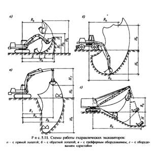 Экскаватор «драглайн» используют для разработки грунтов, расположенных ниже уровня стоянки экскаватора: для отрывки глубоких котлованов, широких траншей, возведения насыпей, разработки грунта из-под воды и т. п. Драглайн применяют также при планировке площадей и зачистке откосов. Достоинство экскаватора - радиус действия до 10 м и глубина копания до 12 м. Глубина копания у экскаватора практически неограничена, конструкция машины позволяет располагать транспортные средства на дневной поверхности и на дне котлована, т. е. уровень грунтовых вод не оказывает влияния на работу экскаватора. Эффективно разрабатывать экскаватором мягкие и плотные грунты, в том числе обводненные. Ковш экскаватора навешивается на канатах на удлиненную стрелу кранового типа. Забрасывая ковш в выемку на расстояние, несколько превышающее длину стрелы, ковш заполняют грунтом путем подтягивания по поверхности земли к стреле. Затем ковш поднимают в горизонтальное положение и поворотом машины перемещают к месту разгрузки. Опорожняется ковш при ослаблении натяжения тягового каната. Применимы разработки грунта лобовой и боковой проходками с отгрузкой грунта в транспорт и отвал. В зависимости от ширины выемки, способа разгрузки грунта (в отвал или в транспортные средства) и особенностей земляного сооружения, в практике нашли применение челночные способы разработки грунта, так как конструктивное решение экскаватора позволяет применять такие схемы. Поперечно-челночная схема дает возможность набирать грунт поочередно с каждой боковой стороны самосвала, подаваемого под погрузку по дну выемки, не прекращая поворота стрелы в момент выгрузки грунта. При продольно-челночной схеме грунт набирают перед задней стенкой кузова и, подняв ковш, разгружают его над кузовом. В цикле работы экскаватора повороты занимают основное время, в этом плане челночные схемы с минимальным углом поворота для погрузки и выгрузки являются оптимальными. Благодаря уменьшению высоты подъема ковша и сокращению угла поворота экскаватора (при продольно-челночной схеме около 0°, а при поперечно-челночной 9...200) производительность экскаватора увеличивается в 1,5...2 раза. Строительные экскаваторы «драглайн» применяют с ковшом вместимостью 0,25...2,5 м3 Грейфер используют в сугубо специфических случаях для отрывки узких глубоких котлованов, траншей, колодцев, при разработке грунта ниже уровня грунтовых вод. Он представляет собой ковш с двумя или более лопастями и канатным или в последнее время стоечным приводом, принудительно смыкающим лопасти. Грейфер навешивается на стрелу и разрабатывает выемки с вертикальными стенками. При повороте стрелы ковш перемещается к месту разгрузки и опорожняется при принудительном раскрытии лопастей. Погружение в грунт осуществляется только за счет собственной массы и принудительного опускания стойки, поэтому можно разрабатывать грунты малой и высокой плотности, в том числе и находящиеся под водой. Строительные экскаваторы «грейфер» применяют с ковшом вместимостью 0,35...2,5 м3.