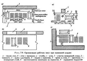 Обратная лопата - это открытый снизу ковш с режущим передним краем, шарнирно соединенный с рукоятью, которая, в свою очередь, шарнирно соединена со стрелой. По мере протягивания назад ковш заполняется грунтом. Затем при вертикальном положении рукояти ковш переводят к месту выгрузки и разгружают путем подъема с одновременным опрокидыванием. Разработку грунта экскаватором «обратная лопата» производят боковым и лобовым забоями с погрузкой грунта в транспорт или в отвал (рис. 5.14). При боковом забое экскаватор разрабатывает выемки сбоку, ширина выемки ограничена радиусом резания, разработка грунта осуществляется поперек гусеничной ленты, т. е. при наименее устойчивом положении экскаватора. При лобовом забое черпание грунта производят при постепенном движении экскаватора задним ходом, разгрузку выполняют в транспортные средства, которые подаются к экскаватору по дну забоя или сбоку по естественной поверхности земли. Ширина забоя ограничивается только требованием нормальной производительности механизма. При лобовом забое экскаватор опускает стрелу с рукоятью в самое нижнее положение между гусеницами, поэтому глубина разработки узких траншей больше, чем широких. Отрывку котлованов шириной до 14 м обычно осуществляют лобовой проходкой при перемещении экскаватора по зигзагу, а при большей ширине - поперечно-торцевой или продольно-торцевой. 12. Организация рабочего места и труда каменщика. Рабочее место каменщика Рабочее место каменщика или звена включает участок возводимой стены, пространство, где размещаются рабочие, необходимые материалы, инструмент и приспособления. Рабочее место может находиться на земле, на межэтажных перекрытиях, на рабочих подмостях и на лесах. При выполнении каменной кладки производительность труда каменщиков зависит от организации рабочего места (рис. 7.9), исключающей не относящиеся к процессу движения рабочих, и обеспечивающей минимальные расстояния перемещения кирпича и раствора от места складирования к месту укладки. Рабочее место должно находиться в зоне действия монтажного крана. Практика подсказала, что общая ширина рабочего места должна быть 2,5...2,6 м, в том числе: рабочая зона — шириной 0,6...0,7 м между стеной и материалами; зона складирования материалов — полоса шириной 1,0...1,6 м дня размещения поддонов с кирпичом и ящиков с раствором; транспортная зона при подаче материалов краном — 0,6...0,75 м, может доходить до 1,25 м дня передвижения рабочих, занятых доставкой и размещением материалов в пределах рабочей зоны.