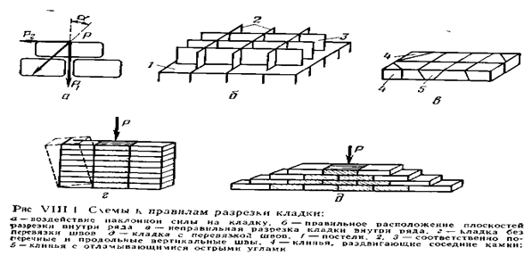Для улучшения теплотехнических показателей кладки пользуются легкими растворами, которые в отличие от обычных тяжелых имеют вместо кварцевого песка шлаковый или пемзовый. В зависимости от прочности на сжатие установлены марки растворов 4...300. Существенное значение имеет подвижность раствора, выражаемая величиной погружения стандартного конуса в сантиметрах. Растворы с большой подвижностью обеспечивают более высокую производительность труда при кладке. Для повышения подвижности и водоудерживающей способности к жестким цементным растворам добавляют пластификаторы — сульфитно-спиртовую барду, мылонафт и др. Подвижность раствора для кирпича и мелких блоков должна быть в пределах 9...13 см, при наличии в них пустот — 7...8 см, для бутовой кладки — 4...6 см; для заливки швов этой кладки — 13...15 см. В зависимости от принятой отделки поверхности стен швы между отдельными камнями полностью заполняют раствором, придавая им определенную форму расшивкой, или оставляют незаполненными на глубину 1...1.5 см. Соответственно кладка носит название под расшивку и впустошовку. Кладку, выполненную впустошовку, впоследствии оштукатуривают или облицовывают. Согласно нормативным требованиям, для кирпича и камней правильной формы толщина горизонтальных швов должна быть не менее 10 и не более 15 мм (средняя 12), вертикальных в пределах 8...15 мм (средняя 10). Развитие каменных работ происходит в тесной связи науки с производством. Наряду с совершенствованием технологии и организации каменных работ развиваются индустриальные методы возведения каменных конструкций с использованием для кладки стен вместо мелкоштучных камней крупных кирпичных блоков и виброкирпичных панелей. Правила разрезки каменной кладки. Для обеспечения работы кладки как монолитного массива и предотвращения перемещения камней под действием нагрузок в процессе эксплуатации конструкции необходимо располагать их, соблюдая определенные условия, которые принято называть правилами разрезки. Первое правило — кладку необходимо вести рядами, ограниченными плоскостями, перпендикулярными направлению действующих сил. Руководствуясь этим правилом, каменную кладку, воспринимающую вертикальные нагрузки, ведут горизонтальными рядами. В арках и сводах плоскости, ограничивающие ряды кладки, должны быть перпендикулярными к кривой давления. При этом обеспечивается работа камней на сжатие и исключаются сдвигающие усилия. Допустимое отклонение перпендикуляра к плоскостям, ограничивающим ряды кладки, с направлением действующих сил, выражаемое углом не должно превышать 15...17°. Величину этого угла определяют из условия уравновешивания сдвигающего усилия от действия наклонной силы и противодействующей ему силы трения. Второе правило — внутри каждого ряда боковые грани камней должны образовывать две системы взаимно перпендикулярных плоскостей. При этом одна система плоскостей должна быть перпендикулярна постели и лицевой поверхности кладки, а вторая — параллельна лицевой поверхности и перпендикулярна постели. Эти плоскости образуют в кладке вертикальные поперечные и продольные швы. Если боковые грани камней в нарушение этого правила будут расположены наклонно, то они, уподобляясь клину, под действием нагрузок могут раздвинуть соседние камни, а кромки камней с острыми углами откол