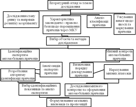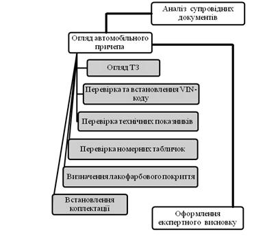 Рис. 2.1. Загальна схема дослідження 2.2 Аналіз видів експертизи автомобільних причепів Експертиза є доволі специфічним видом діяльності, який з ускладненням технологій, розвитком науки і техніки, і, як наслідок, розширенням і ускладненням кола об’єктів, які фігурують у різних видах правовідносин має дедалі частіше застосовуватись для встановлення або уточнення певних фактів, обставин. Відповідно до ускладнення об’єктів, якими люди оперують у різних видах своєї діяльності, а також до того, що правопорушники останнім часом все більше застосовують інтелектуальні методи для прикриття своєї діяльності, розширюється сфера діяльності митних органів, яка об’єктивно обумовлює використання спеціальних знань під час виконання ними своїх функцій. На сьогоднішній день, враховуючи шалені темпи зростання кількості автомобільних причепів, вагоме місце займає автотоварознавча експертиза. Крім того, автомобільна індустрія все більше і більше використовує нові технології у виробництві та в оснащенні транспортних засобів. При таких темпах розвитку експерт зобов’язаний опрацьовувати величезну кількість інформації, здобувати нові навики та використовувати їх в роботі. Також в автотоварознавчій експертизі значне місце займає оцінка транспортних засобів. З метою полегшення даної діяльності друкується велика кількість періодичних видань, спеціальної технічної літератури, а також створюється програмне забезпечення для оперативної обробки інформації про стан та характеристики даного виду транспорту. Експертиза автомобільних причепів на сьогодні посідає важливе місце у процесі просування їх на ринок. Експертиза застосовується від початку виробництва (при сертифікації, аналіз вимог споживачів) до постачання (експертиза при прийманні) та безпосереднього використання (експертиза при постановці на облік та технічний огляд в органах автоінспекції). Виходячи з призначення експертизи транспортних засобів, у тому числі автомобільних причепів можна виділити декілька її видів, що відрізняються між собою метою, умовами проведення та документальним оформленням. Товарознавча, санітарно-епідеміологічна, екологічна та судова – це види експертизи, що найчастіше застосовуються для автомобільних причепів. Товарознавча експертиза є основною, а всі інші види як правило її доповнюють. Експертизу проводять наукові підприємства, організації чи громадяни експерти, які мають право на таку діяльність згідно з Порядком проведення державної акредитації фізичних та юридичних осіб на право проведення наукової та науково-технічної експертизи, затвердженим наказом Міністерства освіти і науки України від 12.01.2004 №12 та зареєстрованим у Міністерстві юстиції України 26.01.2004 за №110/8709. Експерти незалежні від розробника, виробника, постачальника, продавця і власника засобів технічного обслуговування і ремонту (ЗТОІР) фінансово й організаційно, не є розробниками експертованих ними ЗТОІР, мають для експертування кваліфікацію з питань проведення науково-технічної експертизи, зокрема, у сфері експлуатаційних вимог безпеки до технічного стану КТЗ, вимог до ЗТОІР. Висновок науково-технічної експертизи, який оформляють на бланку експерта (окрім фізичних осіб), затверджує їхній керівник (заступник керівника). Фізичні особи підписують висновок експерта о