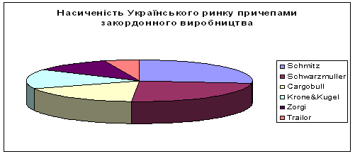 Найбільшу частку на ринку України у 2009–2010 р.р. займали причепи німецького виробництва: Schmitz (Німеччина) близько 27% ринку, Schwarzmuller (Німеччина) близько 24%, Cargobull (Німеччина) близько 18%, Krone&Kugel (Німеччина) близько 15%, Zorgi (Польща) близько 11%, Trailor (Нідерланди) близько 5% (рис. 1.1) [4].