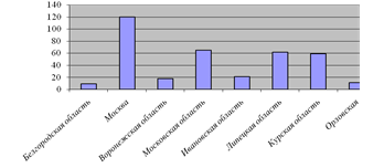 Рис. 1. Количество научно-технических организаций по областям Центрального округа Доля организаций Воронежской области, выполняющих исследования и разработки, составляет в среднем свыше 16 % от числа организаций Центрального округа. По числу научно-технических организаций Воронежская область стоит на третьем месте в Центральном округе после Москвы и Московской области (рис. 2.)