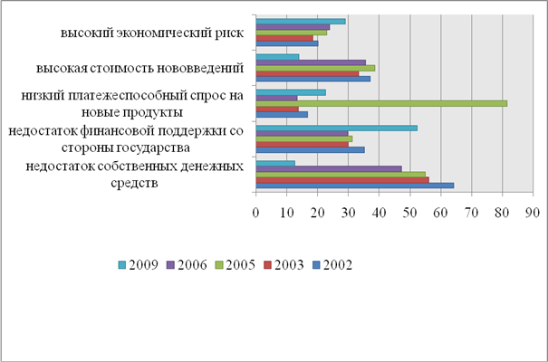 Факторы, препятствующие инновациям, делятся на производственные, экономические и прочие. Среди экономических факторов основное или решающее значение для предприятий Центрального округа и Воронежской области имеют: - недостаток собственных денежных средств; - высокая стоимость нововведений; - недостаток финансовой поддержки со стороны государства. Наибольшее сдерживающее влияние на проведение инновационной деятельности предприятий области оказывают следующие производственные факторы: - низкий инновационный потенциал предприятий; - недостаток квалифицированного персонала. Другие причины: - недостаток законодательных и нормативно-правовых документов, регулирующих и стимулирующих инновационную деятельность; - неразвитость инновационной структуры; - низкий спрос со стороны потребителей на инновационную продукцию; - неразвитость рынка технологий; - неопределенность сроков инновационного процесса (табл. 4). Как видно из таблицы 4, основное или решающее влияние на развитие инновационной деятельности оказывают экономические факторы, среди которых первое место занимает недостаток собственных денежных средств. Достаточно стабильная ситуация, сложившаяся в экономике страны перед кризисом позволила снизить 17% предприятий Воронежской области существенную зависимость от данного фактора. Второе место в этой группе занимает высокая стоимость нововведений. В среднем за анализируемый период этот фактор выделили 36, 15% предприятий. Следующим по значимости стоит фактор недостаток финансовой поддержки со стороны государства (в среднем 31, 6%). Динамика экономических факторов представлена на рис. 1