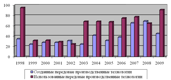 Как видно из таблицы 2 и рис. 2, 3 темп роста количество создаваемых передовых производственных технологий, несмотря на наметившуюся в начале 2000 г.г. тенденцию к росту, в середине этого периода снижался. Однако в условиях кризиса по данным органов государственной статистики произошло довольно значительное увеличение данного показателя. Другими словами, за почти десятилетний период до сих пор не достигнут уровень 1997 г. Однако количество внедряемых – неизменно растет. На наш взгляд, это свидетельствует об использовании не столько инновационных технологий, сколько о новых технологиях для данного предприятия, тем более, если сравнить с данными о количестве купленных и зарегистрированных патентов и лицензий (рис. 3).