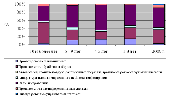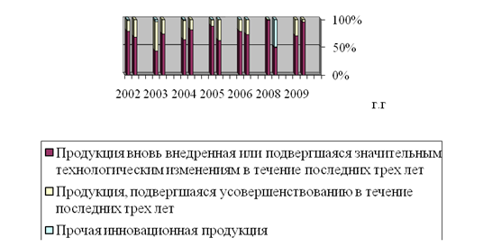 Рис. 4. Динамика количества использованных передовых производственных технологий по годам внедрения В 2009 г. промышленными предприятиями отгружено инновационной продукции собственного производства за пределы РФ – 11, 8% (в 2002 г. – 7, 0%, 2006г. – 5, 0%), в т.ч. продукции, вновь внедренной или подвергшейся значительным технологическим изменениям в течение последних трех лет – 26, 1% (в 2002 г. – 6, 2%, 2006г. – 9%): продукции, подвергшейся усовершенствованию в течение последних трех лет – 0, 3% (в 2002 г. – 12, 0%, 2006г. – 11, 4%). Причина сокращения последнего показателя напрямую связана с сокращением объемов собственного производства инновационной продукции промышленными предприятиями. Однако кризис вынудил предприятия искать новые пути сохранения своего производства. Структура инновационной продукции промышленных предприятий собственного производства, отгруженной промышленными предприятиями области, представлена на рис. 5 .