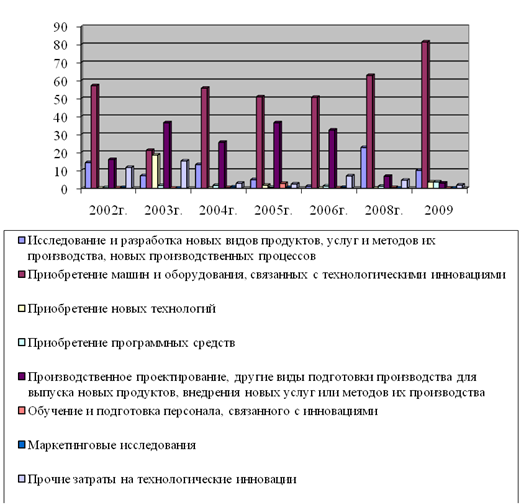 Примечание: первый столбец – всего; второй столбец – за пределы РФ Рис. 5. Структура отгруженной продукции предприятиями Воронежской области В 2009 году продолжала наблюдаться тенденция снижения количества промышленных организаций, имевших инновации. Например, продуктовые инновации имело промышленных организаций на 11, 19% меньше, чем в 2002 г., процессные инновации – на 6, 9%, а и те, и другие – на 50%. При этом затраты промышленных предприятий на эти инновации возрастают. Однако часть эффективных и прогрессивных научно-технических разработок остается невостребованной, т.к. предприятия не в состоянии финансировать их промышленное освоение. Это связано с недостатком финансовых средств у предприятий. По уровню инвестиционного риска Воронежская область в течение 2009 г. переместилась с 28 на 23 место среди российских регионов. По уровню инвестиционного потенциала область занимает 20 место среди субъектов РФ. Уровень кредитоспособности Воронежской области по оценкам рейтингового агентства Moody, s Interfax Rating Agency в 2008-2009 г.г. находится на достаточно высоком уровне, кредитный рейтинг находится на уровне инвестиционного (А 1(rus) и RUS-1). За 2008-2009 г.г. сумма средств областного бюджета, направленных на реализацию инвестиционных проектов производственного назначения, составила 193, 9 млн. руб. В качестве государственной поддержки (из имеющихся в распоряжении машиностроительных предприятий в настоящее время) используется в отдельных случаях компенсация части ставки по привлекаемым предприятиями банковским кредитам. Внедрение данного механизма позволило привлечь в экономику области 1741, 4 млн. руб. кредитных ресурсов. Проведенный анализ внутренних затрат на исследования и разработки позволил установить, что доля Воронежской области в данном показателе РФ в 1997-2009 г.г. составляла менее одного процента, а в ЦФО – 5, 6%. Затраты на технологические инновации в промышленности составляли 75, 4% в 2008г. , 2009г. – 89, 2% (2002 г. - 98, 1%) от данного показателя по Воронежской области. При этом доля этих затрат в машиностроении и металлообработке снизилась на 17, 5%. За анализируемый период изменилась структура затрат на технологические инновации. Если в 2002 г. наибольший удельный вес занимали затраты на приобретение машин и оборудования (57, 1%); производственное проектирование, другие виды подготовки производства для выпуска новых продуктов, внедрение новых услуг или методов их производства (16, 0%); исследования и разработка новых видов продуктов, услуг и методов их производства, новых производственных процессов (14, 3), в 2006 г. наблюдается по первому и третьему показателям снижение соответственно на 7, 1% и 14, 9%, , второму – повышение на 15, 6%. Затраты на приобретение новых технологий в 2002г. составляли всего 0, 1% в общей сумме затрат на технологические инновации, в 2003 г. – 18, 5%, а в 2004 г. новые технологии не приобретались совсем, в 2006 г. - 0, 004% (рис. 6).