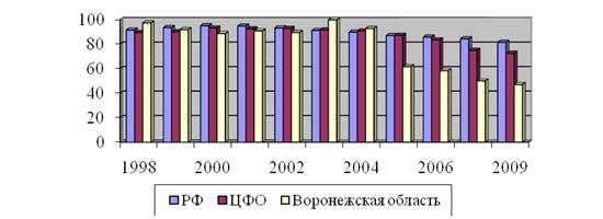Планируется устойчивый рост внутренних затрат на исследования и разработки: до 2% ВВП в 2010 г. и до 2, 5% в 2015 г., при этом увеличивается доля внебюджетных средств во внутренних затратах на исследования и разработки: до 60% в 2010 г. и до 70% в 2015 г в целом по РФ, что должно повлиять и на аналогичные показатели Воронежской области. С точки зрения форм собственности наибольшая инновационная активность характерна для предприятий иностранной, совместной, смешанной и частной форм собственности. Для предприятий государственной собственности характерны значительные колебания рассматриваемых показателей. С одной стороны, недостаточное финансирование, отчисление значительной доли прибыли в доход государства мало стимулируют внедрение инноваций для получения прибыли на этих предприятиях. С другой стороны, государственные предприятия, значительная часть из которых была учреждена много десятилетий назад, по сравнению с вновь созданными негосударственными предприятиями, обладают большим запасом готовых научных разработок, инновационным потенциалом. Таким образом, форму собственности нельзя рассматривать в отрыве от других характеристик предприятий, включая такие, как отраслевая принадлежность и специфика производимой продукции. Проблему недостатка в квалифицированных кадрах отмечают многие промышленные предприятия, однако сложное финансовое положение не дает им возможность решать эту проблему так, как это необходимо. Несколько лучше, чем на других промышленных предприятиях, сложилась ситуация в оборонном секторе, т.к. из-за специфики производства там был сосредоточен высококвалифицированный персонал, который за годы конверсии не был безвозвратно потерян. Самое благоприятное положение, с точки зрения квалификации персонала, у предприятий смешанной формы собственности с зарубежным участием. Там, как правило, проводится переподготовка специалистов на зарубежных фирмах или на местах с помощью иностранных инструкторов. В последнее десятилетие наблюдается тенденция старения и значительного снижения численности персонала, занятого исследованиями и разработками. Так, с 1992 года численность работников, выполняющих исследования и разработки, в РФ снизилась в 1, 8 раза, а в Воронежской области – почти в 2, 5 раза (рис. 7). Если с 2002г. в ЦФО наблюдался рост анализируемого показателя, то в Воронежской области – наоборот. Доля численности персонала Воронежской области, занятого исследованиями и разработками, составляет 1, 1% от этого показателя по РФ, а ЦФО – 6, 5%. По прогнозам, к 2015 году ожидается увеличение численности специалистов, занятых в этой сфере деятельности. Однако она не достигнет уровня 1997 - 1998 гг. Одновременно на фоне уменьшения численности происходит резкое старение научных кадров. Проблема недостаточного притока молодежи в науку остается актуальной более десяти лет.