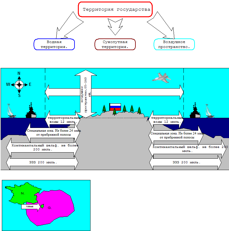ТЕРРИТОРИЯ ГОСУДАРСТВЕННАЯ - часть земного шара, находящаяся под суверенитетом определенного государства. В состав Т. г. входит суша с ее #M12291 820002160недрами#S, воды и лежащее над сушей и водами воздушное пространство. Т. г. обозначаются государственными границами. В пределах своей территории государство осуществляет свое верховенство, которое называется территориальным и является составной частью #M12291 820000836государственного суверенитета#S. АНКЛАВ - часть территории одного государства, полностью окруженная сухопутной территорией др. государства или государств. А. составляет неотъемлемую часть территории того государства, которому принадлежит. В тех случаях когда часть территории одного государства оказывается отрезанной частично сухопутной территорией и частично морском территорией др. государства. такие территории рассматриваются в качестве полуанклавов, поскольку они имеют морской берег, к которому возможен доступ со стороны моря. К полуанклавам можно отнести, напр., Калининградскую #M12291 820002244область#S РФ. Наличие А. влечет за собой определенные правовые последствия, связанные, напр., с проездом в него через территорию др. страны, а также с иными жизненно важными проблемами существования А. и его жителей. Такие вопросы решаются на основе договора между заинтересованными государствами. ГОСУДАРСТВО - АНКЛАВ – государство не имеющее выхода к морю. (Уганда, Руанда, Бурунди). ВОЗДУШНОЕ ПРОСТРАНСТВО - атмосферное пространство государства находящееся над его сухопутной территорией, внутренними и территориальными водами. ТЕРРИТОРИАЛЬНЫЕ ВОДЫ (территориальное море) - в #M12291 820001931международном праве#S полоса прибрежных морских вод определенной ширины, отсчитываемой от линии наибольшего отлива как на материке, так и на островах. Т. в. государства-архипелага начинаются за пределами его архипелажных вод. Ширина Т. в. определяется прибрежным (или архипелажным) государством самостоятельно, по с учетом общепризнанных принципов и норм #M12291 820001931международного права#S. Прибрежное государство (государство-архипелаг) осуществляет полный суверенитет над Т. в., а также над воздушным пространством над ними и над морским дном и его #M12291 820002160недрами#S под ними. Большинство государств мира имеет Т. в. шириной от 3 до 12 морских миль (РФ - 12 морских миль) Согласно Конвенции ООН по морскому праву 1982 г., каждое государство имеет право устанавливать ширину своих Т. в. до предела, не превышающего l2 морских миль, отмеряемых от исходных линий. устанавливаемых в соответствии с конвенцией. Нормальной исходной линией является линия наибольшего отлива вдоль берега государства. Для определения этой линии возможно также использование метода прямых исходных линий, который может применяться в местах, где линия берега глубоко изрезана и извилиста или где вдоль берега в непосредственной близости лежит цепь о-вов. Т. в. отдельных принадлежащих какому-либо государству о-вов, находящихся за пределами общей внешней границы его Т. в., определяются в соответствии с положениями разд. П Конвенции о территориальном море 1958 г. и чч. П и VIII конвенции 1982 г. Порядок определения Т. в. государств-архипелагов предусмотрен ч. IV конвенции 1982 г. Обе упомянутые конвенции предусматривают право мирного прохода морских судов всех флагов через Т. в. любого государства. СПЕЦИАЛЬНАЯ ЗОНА – 