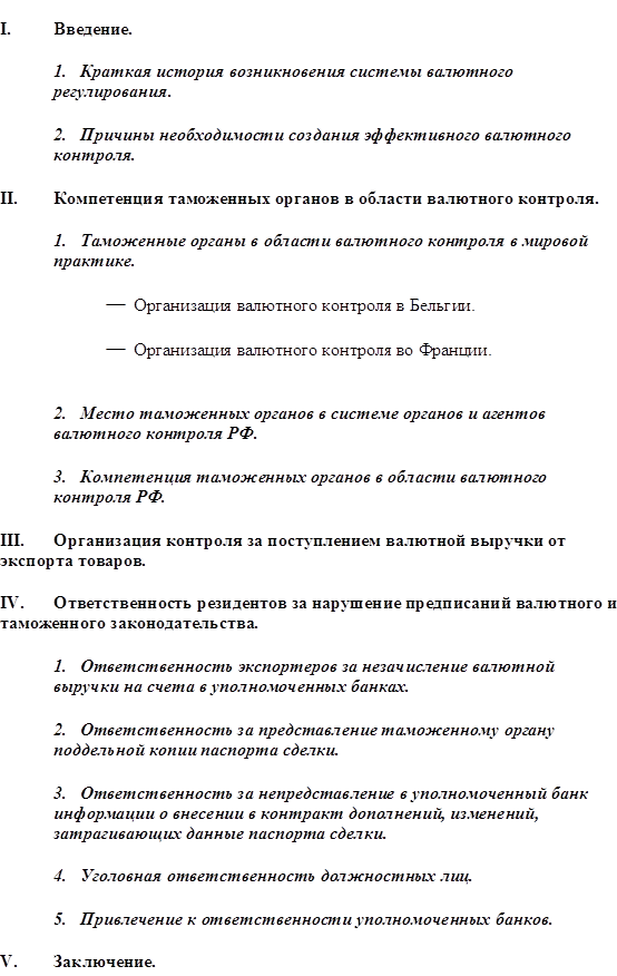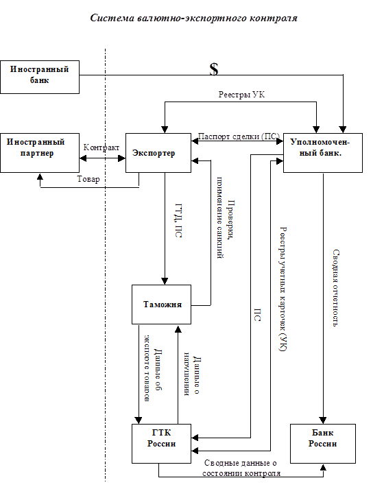 Реферат: Валютный контрольРеферат: Валютный контроль![]() Понятия, используемые в настоящей работе:1. «Резиденты»: а) физические лица, имеющие постоянное местожительство в Российской Федерации, в том числе временно находящиеся за пределами Российской Федерации; б) юридические лица, созданные в соответствии с законодательством Российской Федерации, с местонахождением в Российской Федерации; в) предприятия и организации, не являющиеся юридическими лицами, созданные в соответствии с законодательством Российской Федерации, с местонахождением в Российской Федерации; г) дипломатические и иные официальные представительства Российской Федерации, находящиеся за пределами Российской Федерации; д) находящиеся за пределами Российской Федерации филиалы и представительства резидентов, указанных в подпунктах «б» и «в» настоящего пункта. 2. «Нерезиденты»: а) физические лица, имеющие постоянное местожительство за пределами Российской Федерации, в том числе временно находящиеся в Российской Федерации; б) юридические лица, созданные в соответствии с законодательством иностранных государств, с местонахождением за пределами Российской Федерации; в) предприятия и организации, не являющиеся юридическими лицами, созданные в соответствии с законодательством иностранных государств, с местонахождением за пределами Российской Федерации; г) находящиеся в Российской Федерации иностранные дипломатические и иные официальные представительства, а также международные организации, их филиалы и представительства; д) находящиеся в Российской Федерации филиалы и представительства нерезидентов, указанных в подпунктах «б» и «в» настоящего пункта. 3. «Валютные операции»: а) операции, связанные с переходом права собственности и иных прав на валютные ценности, в том числе операции, связанные с использованием в качестве средства платежа иностранной валюты и платежных документов в иностранной валюте; б) ввоз и пересылка в Российскую Федерацию, а также вывоз и пересылка из Российской Федерации валютных ценностей; в) осуществление международных денежных переводов. г) расчеты между резидентами и нерезидентами в валюте Российской Федерации. 4. «Текущие валютные операции»: а) переводы в Российскую Федерацию и из Российской Федерации иностранной валюты для осуществления расчетов без отсрочки платежа по экспорту и импорту товаров (работ, услуг, результатов интеллектуальной деятельности), а также для осуществления расчетов, связанных с кредитованием экспортно-импортных операций на срок не более 90 дней; б) получение и предоставление финансовых кредитов на срок не более 180 дней; в) переводы в Российскую Федерацию и из Российской Федерации процентов, дивидендов и иных доходов по вкладам, инвестициям, кредитам и прочим операциям, связанным с движением капитала; г) переводы неторгового характера в Российскую Федерацию и из Российской Федерации, включая переводы сумм заработной платы, пенсии, алиментов, наследства, а также другие аналогичные операции. 5. «Валютные операции, связанные с движением капитала»: а) прямые инвестиции, то есть вложения в уставный капитал предприятия с целью извлечения дохода и получения прав на участие в управлении предприятием; б) портфельные инвестиции, то есть приобретение ценных бумаг; в) переводы в оплату права собственности н