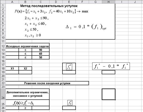Рис. 2. Данные для решения задачи оптимизации по методу последовательных уступок Пример 3. Целевое программирование. Провести оптимизацию