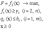 где Предположим, что множественность критериев связана с наличием нескольких сторон, заинтересованных в разрешении проблемной ситуации. Каждая сторона стремится найти и принять решение, при котором ее показатель эффективности (целевая функция) был бы наибольшим. Очевидно, величина показателя эффективности каждой стороны зависит от решений всех остальных сторон. Поэтому наиболее эффективные для одной стороны решения не являются таковыми для других. В связи с этим, стремление каждой стороны добиваться наибольшей эффективности принимаемых ею решений носит конфликтный характер и сама формулировка того, какое решение является приемлемым, хорошим или наилучшим (оптимальным), проблематична. Рассмотрение сложных экономических объектов, характеризующихся целым спектром характеристик, приводит к необходимости введения понятий локального и глобального критериев оптимальности. При этом математически глобальный критерий формулируется в виде скалярной целевой функции, которая обобщенно выражает многообразие целей, или в виде векторной функции, представляющей собой набор несводимых друг к другу частных целевых функций (локальных критериев). Следует отметить, что множественность целей развития экономических систем существенно усложняет планирование, особенно если цели разнонаправленные, и приближение к одним целям удаляет систему от достижения других. В результате возникает задача их согласования. Целью многокритериальной или векторной оптимизации и является отыскание наилучших решений по нескольким критериям. Среди множества многокритериальных задач можно выделить задачи четырех типов: Задачи оптимизации на множестве целей, каждая из которых должна быть учтена при выборе оптимального решения. Примером может служить задача составления плана работы предприятия, в которой критериями служит ряд экономических показателей; Задачи оптимизации на множестве объектов, качество функционирования каждого из которых оценивается самостоятельным критерием. Если качество функционирования каждого объекта оценивается несколькими критериями (векторным критерием), то такая задача называется многовекторной. Примером может служить задача распределения дефицитного ресурса между несколькими предприятиями. Для каждого предприятия критерием оптимальности является степень удовлетворения его потребности в ресурсе или другой показатель, например, величина прибыли. Для планирующего органа критерием выступает вектор локальных приоритетов предприятий; Задача оптимизации на множестве условий функционирования. В задачах такого типа задан спектр условий, в которых предстоит работать объекту, и применительно к каждому условию качество функционирования оценивается некоторым частным критерием; Задачи оптимизации на множестве этапов функционирования. Рассматривается функционирование объектов на некотором интервале времени, разбитом на несколько этапов. Качество управления на каждом этапе оценивается частным критерием, а на множестве этапов – общим векторным критерием. Примером может служить распределение квартального плана цеха по декадам. В каждой декаде необходимо обеспечить максимальную загрузку. В результате получится критерий максимизации загрузки в каждой декаде квартала. Многокритериальные задачи можно так