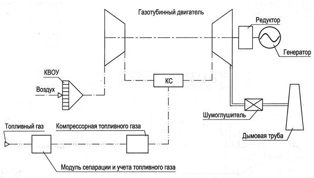 Теплотворная способность – 8546 – 9163 ккал/м3. Содержание капельной жидкости – не более 100 г/м3. Содержание механических примесей – не более 50 мг/м3. Максимальный размер частиц механических примесей – не более 1000мк. Для обеспечения требуемого качества (топливный газ не должен содержать серы, загрязняющих веществ, воды и жидких углеводородов) и необходимого давления топлива (Рminизб=1.5 МПа и Рmaxизб=2,1 МПа) на входе в газовую турбину на территории станции предусматривается установка подготовки газа включающая в себя: удаление большого объема жидких фракций, повышение давления топливного газа, фильтрацию и учет газа, поставки фирмы Solar Turbines. Установка состоит из: - модуля сепарации и учета топливного газа; - здания компрессорной топливного газа. Модуль сепарации и учета топливного газа. На вход модуля подается топливный газ низкого давления. Жидкие фракции углеводорода и воды, содержащие в газе, удаляются в двухфазном сепараторе, который может содержать да 1.6 м3 жидкости. Далее газ направляется в здание компрессорной топливного газа. Жидкость, удаленная из газа, собирается в нижней части сосуда и насосом перекачивается в автоцистерну или дренажную систему. Здание компрессорной топливного газа. В здании размещаются три компрессора. Два рабочих и один резервный. Компрессор топливного газа – ротационный, винтового типа. В компрессор впрыскивается смазочное масло, которое предохраняет лопасти от изнашивания и является уплотнителем. Приводом компрессора является электромотор, сидящий на одном валу с компрессором. Газ, поступающий в здание, направляется в скруббер газа на всасе компрессора, являющейся двухфазным сепаратором, в котором удаляются оставшиеся после сепарации в модуле топливного газа частицы жидкости. Газ, выходящий из компрессора, захватывает с собой смазочное масло, которое удаляется в масляной ловушке. Ловушка представляет собой двухфазный коалесцентный фильтр с высокой эффективностью удаления частичек масла. После масляной ловушки газ направляется в охладитель газа, располагаемый возле здания компрессорной. Смазочное масло, отделенное от газа в ловушке, подается в охладитель масла, который является составной часть охладителя газа. Далее охлажденное масло, пройдя фильтры, где удаляются твердые частицы величиной 10 микрон и более, подается в боковое входное отверстие компрессора топливного газа. Компрессор оснащен панелью управления и аварийной сигнализацией. Газ высокого давления из здания компрессорной направляется обратно в модуль сепарации и учета газа, где поступает в скруббер топливного газа, являющийся коалесцирующим фильтром. В скруббере удаляются мелкие частицы, находящиеся в газе. Топливный газ после скруббера направляется к турбине. Учет топливного газа производится измерительным устройством, меряющим перепад давления на измерительной диафрагме, установленной после скруббера топливного газа. По перепаду давления вычисляется расход топливного газа. Замерное устройство позволяет менять диафрагму во время работы. 4. ОСНОВНОЕ ОБОРУДОВАНИЕ Газотурбинный энергоблок «Таурус-60» представляет собой комплектный силовой модуль, оснащенный дополнительными и вспомогательными системами, необходимыми для нормальной эксплуатации при подсоединении к соответствующим системам электростанции. Газотур