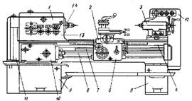 Рисунок 1. Сборочные единицы (узлы) и механизмы токарно-винторезного станка. 1 - передняя бабка, 2 - суппорт, 3 - задняя бабка, 4 - станина, 5 и 9 - тумбы, 6 - фартук, 7 - ходовой винт, 8 - ходовой валик, 10 - коробка подач, 11 - гитары сменных шестерен, 12 – электро - пусковая аппаратура, 13 - коробка скоростей, 14 – шпиндель. Токарно-винторезные станки предназначены для обработки, включая нарезание резьбы, единичных деталей и малых групп деталей. Однако бывают станки без ходового винта. На таких станках можно выполнять все виды токарных работ, кроме нарезания резьбы резцом. Техническими параметрами, по которым классифицируют токарно-винторезные станки, являются наибольший диаметр D обрабатываемой заготовки (детали) или высота Центров над станиной (равная 0,5 D), наибольшая длина L обрабатываемой заготовки (детали) и масса станка. Ряд наибольших диаметров обработки для токарно-винторезных станков имеет вид: D = 100, 125, 160, 200, 250, 320, 400, 500, 630, 800, 1000, 1250, 1600, 2000 и далее до 4000мм. Наибольшая длина L обрабатываемой детали определяется расстоянием между центрами станка. Выпускаемые станки при одном и том же значении D могут иметь различные значения L. По массе токарные станки делятся на легкие - до 500кг (D=100-200 мм), средние - до 4 т (D=250-500мм), крупные - до 15 т (D=630-1250мм) и тяжелые - до 400 т (D=1600-4000мм). Легкие токарные станки применяются в инструментальном производстве, приборостроении, часовой промышленности, в экспериментальных и опытных цехах предприятий. Эти станки выпускаются как с механической подачей, так и без нее. На средних станках производится 70-80% общего объема токарных работ. Эти станки предназначены для чистовой и получистовой обработки, а также для нарезания резьбы разных типов и характеризуются высокой жесткостью, достаточной мощностью и широким диапазоном частот вращения шпинделя и подач инструмента, что позволяет обрабатывать детали на экономичных режимах с применением современных прогрессивных инструментов из твердых сплавов и сверхтвердых материалов. Средние станки оснащаются различными приспособлениями, расширяющими их технологические возможности, облегчающими труд рабочего и позволяющими повысить качество обработки, и имеют достаточно высокий уровень автоматизации. Крупные и тяжелые токарные станки применяются в основном в тяжелом и энергетическом машиностроении, а также в других отраслях для обработки валков прокатных станов, железнодорожных колесных пар, роторов турбин и др. Все сборочные единицы (узлы) и механизмы токарно-винторезных станков имеют одинаковое название, назначение и расположение. Весь упор в работе делается на развитие познавательных и творческих способностей личности учащихся. Нигде не сказано: научить строгать или пилить, допустим, деревянную планку, или научить точить болты (хотя эти элементы и присутствуют). Побуждая учеников сознательно и творчески разрабатывать новые изделия, мы явственно увидим ту разницу, которая пока плохо воспринимается будущими учителями при произнесении слов «деятельность продуктивного или репродуктивного характера». Накопленный опыт преподавания технологии в российской школе позволяет констатировать: при правильно поставленных задачах повышается качество образования, развиваются качества личности, логическое мышление, умение планировать, инициатива, видение перспективы, поиск и обра