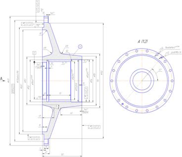 Рисунок 1.3 – Деталь в сборочной единице «Ротор» Поверхности детали «Полумуфта» предназначены: - внутренний диаметр Æ115Н7 предназначен для базирования на поверхности вала ротора; - внутренний диаметр Æ132Н7 предназначен для базирования на поверхности вала ротора; - наружный диаметр Æ335js6 и торец Æ405/Æ335js6, l5 предназначен для базирования детали к обойме; - поверхности зубьев Æ120Н9/Æ131,25Н9 служат для передачи крутящего момента от полумуфты к ротору; - 2 отв. М10 -7Н предназначены для установки отжимных винтов; - 18 отв. Æ14Н7 предназначены для прикрепления полумуфты к обойме пальцами и гайками. Остальные поверхности являются свободными, т.е. в процессе работы не контактируют с другими деталями. 2.2 Анализ детали на технологичность Показатели технологичности делятся на качественные и количественные. К качественным показателям относятся следующие факторы: - материал детали; - базирование и закрепление; - простановка размеров; - допуски формы и расположения; - взаимозаменяемость; - нетехнологичные конструктивные элементы. К количественным показателям технологичности относятся: - коэффициент использования заготовки и материала; - коэффициент точности; - коэффициент шероховатости; - себестоимость; - коэффициент унификации. Технологичной считается та конструкция, обработка которой возможна с максимальной производительностью труда и минимальной себестоимостью. 2.2.1 Качественная оценка технологичности конструкции Материал детали – углеродистая качественная Сталь40 ГОСТ 1050-88. Назначение – оси, коленчатые валы, вал-шестерни, штоки, шестерни, бандажи, детали турбин, детали арматуры, шатуны, шпиндели, звездочки, распределительные валики, болты, головки цилиндров, шпонки, фрикционные диски, плунжеры, крепежные детали котлов и трубопроводов ТЭС и АЭС, паровых и газовых турбин, корпусные детали газовых турбин, цельнокованые валы гидравлических турбин. Заменитель – Сталь35, Сталь45, Сталь40Г. Химический состав стали [2 с.93] см. таблицу 1.2. Таблица 1.2 - Химический состав стали, %