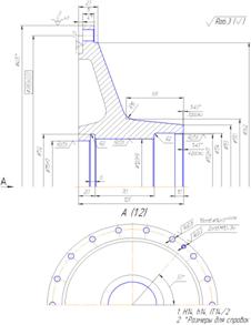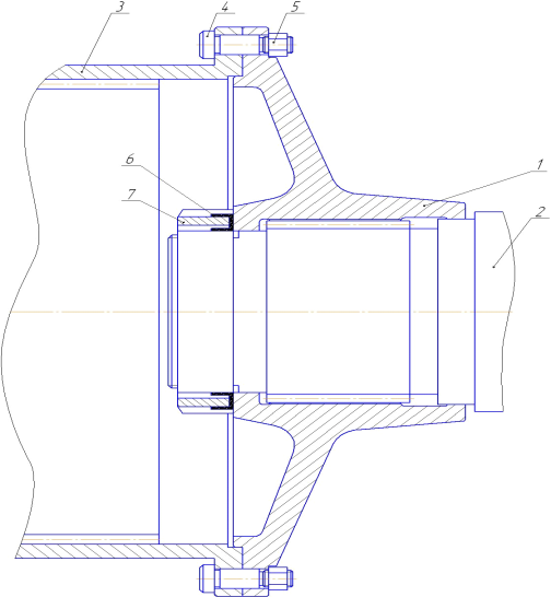 Рисунок 1.2 – Деталь «Полумуфта» Деталь «Полумуфта» входит в сборочную единицу «Ротор». Полумуфта предназначена для передачи крутящего момента от вала привода на вал ротора посредством зубчатого соединения. Деталь 1 базируется на валу ротора 2 и фиксируется круглой гайкой 7 и отгибной шайбой 6. Соединение детали с приводом осуществляется через обойму 3, пальцы 4 и гайки 5 (см. рисунок 1.3)