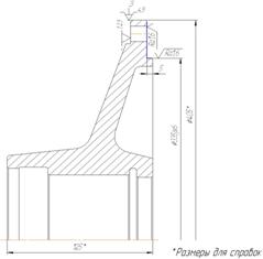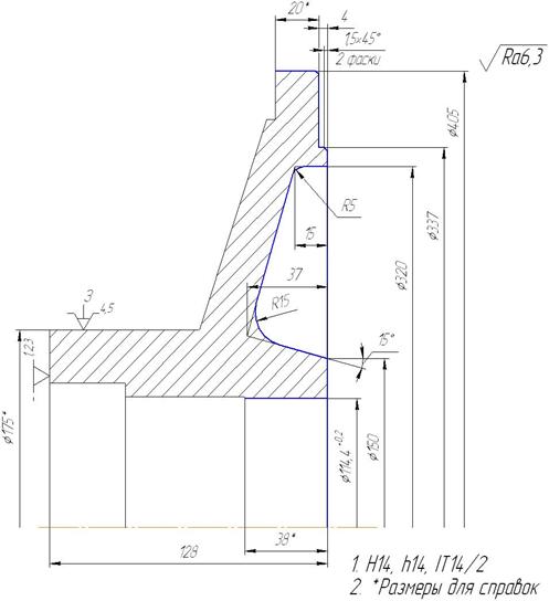 Рисунок 1.13 – Эскиз детали на операции 060 065 Контроль ОТК На данной операции на контрольной плите контролируются размеры, полученные на данной операции технологического процесса. Мерительный инструмент: Калибр-пробка Æ14Н7 СТП3300-2339-82 070 Слесарная Зачистить поверхности детали от заусенцев, которые образовались после механических операций. Вспомогательный инструмент: Шкурка наждачная Напильник 6.3 Краткое описание предлагаемого технологического процесса по операциям 005 Заготовительная Заготовкой в предлагаемом технологическом процессе служит поковка штампованная на кривошипном горячештамповочном прессе. Обоснования выбора способа получения заготовки см. п.1.4.2 010 Термическая Термообработка – нормализация. Подробнее см. п.1.6.2 015 Контроль ОТК На данной операции на контрольной плите контролируются размеры, полученные на заготовительной операции технологического процесса. Мерительный инструмент: Штангенциркуль ШЦ – III – 500 – 0,1 ГОСТ 166-80. 020 Изготовление и испытание образцов Подробнее см. п.1.6.2 025 Токарная с ЧПУ После получения положительных результатов испытания образцов, заготовка устанавливается в трехкулачковом самоцентрирующем патроне и обрабатывается согласно эскиза (см. рис. 1.14) Деталь базируется и закрепляется в трехкулачковом самоцентрирующем патроне Æ500 В целом деталь лишена пяти степеней свободы. Имеют место две технологические базы: - установочная, торец детали, лишает деталь трех степеней свободы: перемещений вдоль оси Z и вращений вокруг осей X и Y; Обеспечивает все линейные размеры. - двойная опорная, наружная цилиндрическая поверхность Æ415мм, лишает деталь двух степеней свободы: перемещений вдоль осей X и Y. Обеспечивает все диаметральные размеры, а также соосность обрабатываемых поверхностей. Оборудование: Токарно-винторезный станок с ЧПУ мод. MDW43 Вспомогательный инструмент: Патрон 7100 – 0017 П ГОСТ 2675 – 80 Режущий инструмент: Резец токарный подрезной упорный с механическим креплением твердосплавной неперетачиваемой пластинки. Обозначение: Резец PCLNR4040S19 пластина CNM1906 Т5К10 ГОСТ26611-85 Резец токарный расточной. Обозначение: Резец PCLNR4040S19 пластина CNM1906 Т5К10 ГОСТ26611-85