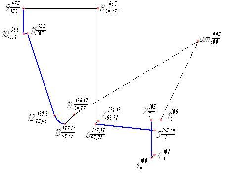 Рисунок 1.19 – Траектория движения режущего инструмента №1 И.т. – 1 – на ускоренной подаче резец №1 из исходной точки подходит к детали; 1 – 2 – на подаче 5мм/об резец подходит к торцу детали Z 0; 2 – 3 – на рабочей подаче подрезается торец начерно; 3 – 4 – отход от детали на 1мм. под 45 градусов; 4 – 5 – подход к конической поверхности; 5 – 6 – на рабочей подаче точится коническая поверхность начерно; 6 – 7 – отход от детали на 1мм. под 45 градусов; 7 – 8 – подход к диаметру Ø420мм; 8 – 9 – подход к торцу Z – 104 мм; 9 – 10 – на рабочей подаче подрезается торец начерно в размер 104; 10 – 11 – на рабочей подаче точится диаметр Ø366 начерно; 11 – 12 – на рабочей подаче точится коническая поверхность начерно; 12 – 13 – на рабочей подаче точится радиус 13 начерно; 13 – 14 – отход от детали на 1мм. под 45 градусов; 14 – и.т. – инструмент на ускоренной подаче возвращается в исходную точку.