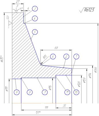 Рисунок 1.20 – Траектория движения режущего инструмента №2 И.т. – 15 – на ускоренной подаче резец №2 из исходной точки подходит к детали; 15 – 16 – на подаче 5мм/об резец подходит к Ø116мм; 16 – 17 – на рабочей подаче растачивается Ø116мм начерно; 17 – 18 – на рабочей подаче подрезается торец начерно в размер 111; 18 – 19 – на рабочей подаче растачивается Ø111мм начерно; 19 – 20 – отход от детали на 1мм. под 315 градусов; 20 – 21 – выход из детали Z 1мм; 21 – 22 – подход к диаметру Ø128мм; 22 – 23 – на рабочей подаче растачивается Ø128мм начерно; 23 – 24 – на рабочей подаче подрезается торец начерно в размер 35; 24 – 25 – выход из детали Z 1мм; 25 – и.т. – инструмент на ускоренной подаче возвращается в исходную точку. 7.2 Выбор режимов резания и нормирование операций технологического процесса Выбор режимов резания для операции 025 токарная с ЧПУ производится по [12]. Паспортные данные на токарный патронно-центровой станок с ЧПУ модели MDW 43 Станок предназначен для токарной обработки деталей длиной до 4000 мм и весом до 2000 кг сложной криволинейной поверхности, а также сверления, фрезерования и шлифования наружных цилиндрических и торцевых поверхностей. На станке возможно нарезание цилиндрических и конических резьб с шагом 0,001-2000 мм, а также с увеличивающимся или уменьшающимся шагом. Рабочие диапазоны: 1. Высота центров, мм 471 2. Наибольший диаметр изделия над станиной, мм 830 3. Наибольший диаметр изделия над поперечными салазками, мм 640 4. Диаметр обработки над инструментальным кожухом, мм 430 5. Длина обточки, мм 3500 Главный шпиндель: 6. Диаметр шпинделя в переднем подшипнике, мм 230 7. Диаметр отверстия в шпинделе, мм 128 Главный привод: 8. Мощность привода, кВт 63 9. Минимальное число оборотов, об/мин 10 10. Максимальное число оборотов, об/мин 710 11. Программируемые числа оборотов бесступенчатые Приводы подачи: 12. Скорость подачи поперечно/продольной, мм/мин 0,01-3000 13. Скорость подачи поперечно/продольной, мм/об 0,001-50 14. Ускоренный ход, мм/мин 10000 15. Усилие подачи поперечно, Н 8000 16. Усилие подачи продольно, Н 3600 Крестовые салазки: 17. Поперечный ход, мм (по оси X) 560 18. Продольный ход, мм (по оси Z) 3500 Устройство автоматической смены инструмента: 19. Количество инструментов магазин/патрон 46/1 20. Время смены инструмента, сек 35 Габариты станка(без ЧПУ): 21. Длина, мм 8830 22. Ширина, мм 1900 23. Высота, мм 2700 24. Вес станка(без ЧПУ), кг 19200