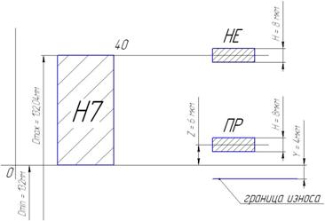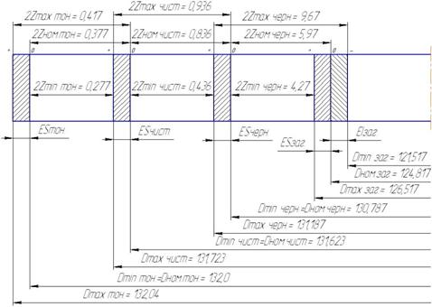 Допуск заготовки dзаг определен в п.4,2 и равен dзаг=5,0 мм (ES=1,7 мкм; EI=3,3 мкм). Допуски по переходам определяются по [9]: - для растачивания чернового Н12: dчерн=0,4 мм (ES=0,4 мм; EI =0 мм); - для растачивания чистового Н9: dчист=0,1 мм (ES=0,1 мм; EI=0 мм); - для растачивания тонкого Н7: dтон=0,04 мм (ES=0,04 мм; EI=0 мм);. Размеры поверхности после тонкого растачивания определяются по формулам: