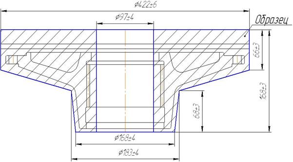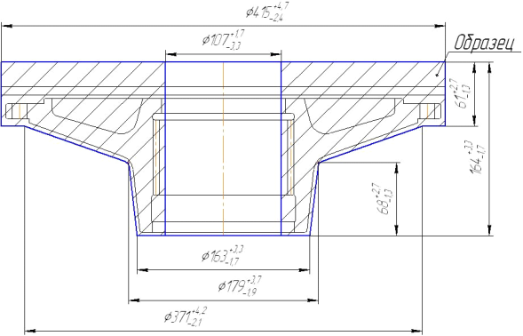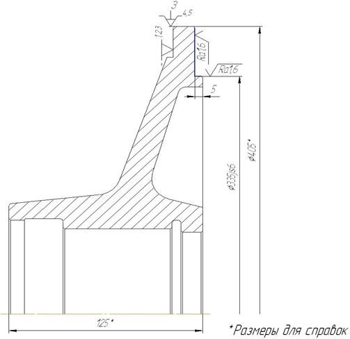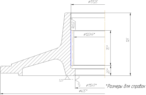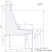 Рисунок 1.4 - Эскиз поковки втулки с уступом и с отверстием Так как соотношения размеров правильны, то, следовательно, выбранный тип поковки верный. Припуски и предельные отклонения на размеры детали назначаются по [5 с.26, т.12].: - на диаметр Ø405 мм. припуск и предельное отклонение - 17± 6 мм; - на диаметр Ø170 мм. припуск и предельное отклонение - 13± 4 мм; - на диаметр Ø155 мм. припуск и предельное отклонение - 13± 4 мм; - на диаметр Ø115 мм. припуск и предельное отклонение - 18± 4 мм; - на общую высоту 125 мм. припуск и предельное отклонение - 12± 3 мм; - на высоту фланца 23 мм. припуск и предельное отклонение - 12± 3 мм; Окончательно размеры поковки определяются по формуле: