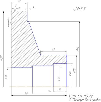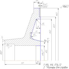 Расчёт размеров заготовки выполняется табличным способом, результаты вычислений приведены в таблице 1.5 Так как из поковки требуется отрезать образец в=20, плюс припуск на отрезку, значит длина поковки L=125+12+20+11=168 мм, тогда высота фланца l=23+12+20+11=66 мм. Таблица1.5 – Результаты вычислений размеров заготовки