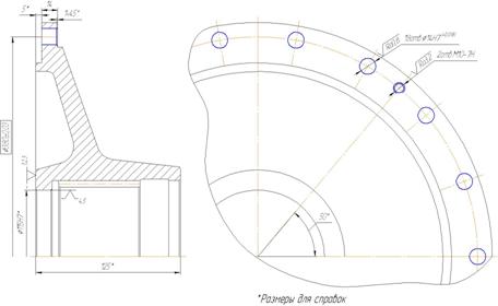 Тогда отношение фигур GП /GФ=36/145,8=0,247. Степень сложности - С3 [с.29, пр.2]. Исходный индекс - 18 [с.10, т.2]. Конфигурация поверхности разъема штампа - П (плоская) [с.8, т. 1]. Зная исходный индекс, размеры поверхностей и параметр шероховатости Ra, который необходимо достичь после механической обработки, определяются основные припуски на механическую обработку [с.12, т.3], допуски и допускаемые отклонения линейных размеров [с.17, т.8]. Основные припуски на размеры (на сторону), мм: - на диаметр Ø405 мм. и шероховатость поверхности Ra=6,3 мкм – 4,3мм - на диаметр Ø362 мм. и шероховатость поверхности Ra=6,3 мкм – 3,8мм - на диаметр Ø170 мм. и шероховатость поверхности Ra=6,3 мкм – 3,5мм - на диаметр Ø155 мм. и шероховатость поверхности Ra=6,3 мкм – 3,2мм - на диаметр Ø115 мм. и шероховатость поверхности Ra=1,6 мкм – 3,2мм - на высоту 125 мм. и шероховатость поверхности Ra=6,3 мкм – 3,2мм - на высоту 23 мм. и шероховатость поверхности Ra=6,3 мкм – 2,7мм Дополнительные припуски, учитывающие: - смещение по поверхности разъема штампа - 0,4 мм [с.14, т.4]; - изогнутость, отклонения от плоскостности и прямолинейности - 0,5 мм [с.14, т.5]; Расчёт размеров заготовки выполняется табличным способом, результаты вычислений приведены в таблице 1.6 Так как из поковки требуется отрезать образец в=20, плюс припуск на отрезку, значит длина поковки L=125+6,4+20+11=164,2 мм, тогда высота фланца l=23+3,2+2,7+20+11=60,8 мм. Таблица1.6 – Результаты вычислений размеров заготовки