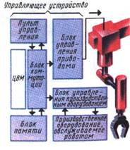 Рис. 4. Структурная схема робота. Робот – манипулятор, встав на рабочее место, согласовывает свою работу с обслуживаемым технологическим оборудованием. Движения руки точные, повороты строго рассчитаны во времени. Робот с оборудованием образует автоматизированную ячейку. Из таких ячеек составляют робототехнологические комплексы или линии. Одно из наиболее распространённых занятий роботов – манипуляторов – окраска изделий. Окрашивают обычно способом набрызгивания. Чтобы защититься от вредного действия распыляемой краски, приходится работать в специальной маске, а рабочую зону оборудовать специальными защитными устройствами. Это сложно, дорого и все равно небезвредно для человека. Если же окраску изделий поручить манипулятору, а управление им человеку, это оздоровит условия работы и повысит производительность труда. Процессы формовки кирпича обычно высокомеханизированы. За формовкой следуют операции пропаривания, обжига, требующие перекладывания кирпича и складывания его в пирамиды определённой конфигурации. Эти операции также можно механизировать и автоматизировать, используя манипуляторы. Механическая рука может брать одновременно 5-6 и более кирпичей, каждый из которых весит до 4 кг, и не боится обжечься, даже если они только что из печи. Стеклянные заготовки для телевизионного кинескопа могут весить 10-15 кг. Сложный технологический процесс их изготовления требует многократной установки, съёма, погрузки. Сотни людей были заняты этой малопроизводительной работой, но им на смену пришли механические руки. Эти несколько скупых примеров ясно свидетельствуют о том, как широко поле деятельности, открывающееся перед автоматическими манипуляторами в самых различных областях производства. РОБОТЫ ПЕРВОГО ПОКОЛЕНИЯ – ОБУЧАЕМЫЕ МАНИПУЛЯТОРЫ Каждый промышленный робот – манипулятор состоит из двух основных частей: манипулятора и устройства управления. Первая отвечает за все необходимые движения, вторая – за управление ими. Описывая конструктивную компоновку робота для промышленности, трудно удержаться от сравнения его с «конструкцией» человека. Каждый промышленный робот имеет мозг – блок управления и механическую часть, включающую тело и руку. Тело робота – это, как правило, массивное основание или, как его называют, станина, а рука – многозвенный рычажный механизм – манипулятор. Чтобы рука могла совершать положенное ей многообразие движений, она имеет мышцы – привод. Задача мышц – преобразовывать сигналы блока управления в механические перемещения руки. Венчает механическую руку кисть или захватное устройство – схват. Большинство промышленных роботов имеет одну руку, но существуют и роботы, обладающие двумя, тремя и более руками. Взглянув на руки промышленного робота, почти любой человек, даже не обладающий проницательностью Шерлока Холмса, сможет, немного подумав, определить сферу «профессиональных интересов» робота. Вот клешни из трёх крюков для круглых поковок, вот присоски, как у осьминога, для стеклянных листов, вот ковш для сыпучих материалов, и т.д. и т.п. Ещё проще разобраться в обязанностях робота, если руки его снабжены специализированным инструментом: сверлом, краскораспылителем, гайковёртом и др. Инструмент закреплён прямо на руке, а не в схвате, теперь уже ненужном. Различают руки роботов и по
