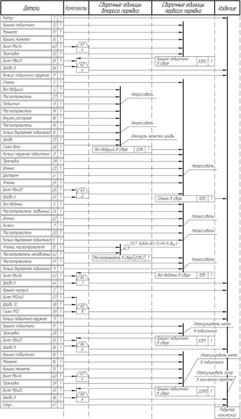 Рисунок 1 – Редуктор одноступенчатый конический Основные сборочные единицы: 1 – корпус; 2 – крышка корпуса; 3 – стакан; 4 – вал быстроходный; 5 – вал тихоходный; 6 – шестерня; 7 – колесо; 8, 9 – подшипники; 10, 11, 12 – крышки подшипников; 13, 14 – крышка манжеты; 15 – фланец маслоотражателя; 16, 17 – манжеты; 18 – втулка распорная; 19, 20, 21, 27 – маслоотражатель; 22, 23 – шпонки; 24 – маслоотражатель подвижный; 25, 36, 38, 44, 45 – шайбы; 26 – гайка вала; 28, 29, 30, 31, 32 – прокладки; 33 – фланец; 34, 35, 37, 43 – болты; 39 – гайка; 40 – винт; 41 – сапун; 42 – маслоотражатель неподвижный. Технические требования: 1. Обеспечить зазор в коническом зацеплении в пределах 0,05…0,08 подбором количества прокладок 30; 2. Обеспечить натяг в подшипниках опор ведущего и ведомого валов в пределах 0,01…0,03 подбором количества регулировочных прокладок 30 и 28 соответственно; 3. Ведущий вал собранного редуктора должен проворачиваться от руки плавно без заеданий. Описание конструкции. Данный конический редуктор служит для изменения крутящего момента по величине и по направлению. Чугунный корпус редуктора 1 совместно с крышкой корпуса 2 несут в себе все составные части. Крутящий момент от ведущего горизонтального вала 4 передается посредством конической пары 6, 7 на ведомый вертикальный вал 5. Наружные обоймы конических подшипников 8 опор ведущего вала 4 установлены в стакане 3, который размещается в корпусе 1. Смазка зубчатого зацепления осуществляется разбрызгиванием масла из ванны расположенной в корпусе 1. Уровень ванны не должен превышать нижней кромки отверстия стакана 3. Сварной неподвижный маслоотражатель 15 не позволяет проникать маслу к коническому подшипнику 9 нижней опоры ведомого вала 5, а подвижный маслоотражатель 24 защищает его от попадания брызг масла. Компенсация изменений объема масла осуществляется посредством сапуна 41. Смазка всех подшипников (консистентная) осуществляется посредством пресс-масленок (на схеме не показаны). Отражатели консистентной смазки 19, 20, 21 и 27 предотвращают ее попадание во внутренние полости, а манжеты 16 и 17 предотвращают попадание смазки наружу и предохраняют подшипники от внешней пыли. Сборочные единицы первого порядка: - 1Сб12 — Крышка подшипника в сборе (в этой сборочной единице – крышка подшипника 12, манжета 17, крышка манжеты 14, винт 40, прокладка 32); - 1Сб3 — Стакан в сборе (в этой сборочной единице – стакан 3, вал ведущий в сборе 2Сб4, крышка подшипника в сборе 2Сб10, шестерня 6, шпонка 23, фланец 33, болт 34, прокладка 29); - 1Сб5 — Вал ведомый в сборе (в этой сборочной единице – вал ведомый 5, колесо 7, шпонка 22, два подшипника 9 без наружных обойм; маслоотражатели 20 и 21; маслоотражатель в сборе 2Сб42, маслоотражатель подвижный 24); - 1Сб11 — Крышка подшипника в сборе (в этой сборочной единице – крышка подшипника 11, прокладка 28); - 1Сб10 — Крышка подшипника в сборе (в этой сборочной единице – крышка подшипника 10, манжета 16, крышка манжеты 13, винт 40, прокладка 39). Сборочные единицы второго порядка: - 2Сб4 — Вал ведущий в сборе (в этой сборочной единице – вал ведущий 4, два подшипника 8, втулка распорная 18, маслоотражатели 19 и 27, кольцо 25, гайка вала 26); - 2Сб42 — Маслоотражатель в сборе – соединение сваркой (в этой сборочной единице – маслоотражатель неподвижный 42, фланец маслоотражателя 15). Технологическая схема сборки редуктора представлена на рисунке 2.