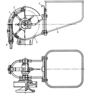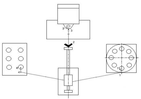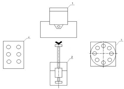 Рис. 5. Загрузочно-накопительное устройство В дисковом устройстве с захватными органами 2 в виде крючков предметы обработки (ПО) расположены в бункере 5, снабженном предбункером 4. Благодаря последнему можно иметь большой запас ПО, однако эта масса не воздействует на процессы в бункерном ЗУ, так как с помощью задвижки 3 к рабочим органам поступает лишь строго дозированная порция ПО. Благодаря наклону дна бункера, изменяющемуся поперечному сечению бункера и за счет сил трения и тяжести ПО к моменту захвата занимают благоприятное для захвата положение, располагаясь открытой частью вперед, что и определяет массовый захват. Захваченные крючками ПО транспортируются к лотку-магазину 6, причем правильное положение ПО сохраняется с помощью специальной трубки 1. Если перед входом в трубку по какой-либо причине ПО не занимает требуемого положения, то под действием амортизатора вибратора он сбрасывается или меняет положение. Выдача предметов обработки происходит под действием силы тяжести в лоток. Если лоток будет переполнен, то либо ПО не будет выдан в лоток, останется на захватном органе и совершит еще один цикл движения до выдачи, либо ПО упрется в ПО в лотке, захватный орган остановится и начнет работать амортизатор-вибратор. Амортизатор-вибратор будет работать и в том случае, когда заготовка застрянет, например, на входе трубки 1. После обработки заготовки на станке робот перемещает полученную деталь на паллеты так, чтобы она заняла ориентированное положение. Таким образом второе ЗНУ, для готовых деталей, будет представлять собой многоярусные паллеты. 4. Выбор технологической операции из ТП для автоматизации Составим временную структуру операции фрезерования. Время для обработки детали: Т=tобр.+ tзпд.+ tрпд.+ tпер.+ tпод.+ tус.д.+ tснят.д.+ tчч.+ tо+ tпрост. +tперед, где tобр. – время обработки; tзпд. – время загрузки партии деталей; tрпд. - время разгрузки партии деталей; tпер. – время переналадки станка; tпод. – время подналадки станка; tуст.д – время установки детали; tснят.д. – время снятия детали; tчч – время чтения чертежа; tо – время отдыха; tпрост. – время простоя; tперед – время передвижения робота; С целью упрощения примем: станок фрезерование автоматизация технологический Т=tобр + tпер. + tус.д. + tснят.д. + tперед. 5. Проектирование компоновки РТК Для проектируемого РТК выбираем круговую компоновку, отличающуюся тем, что оборудование располагается вокруг промышленного робота. При этом робот обсуживает все позиции РТК. Круговую компоновку характеризует минимальное время обслуживания, неудобство обслуживания для оператора, минимальное количество оборудования, которое можно расположить около робота, так как зона определяется параметрами промышленного робота. РТК включает в себя: металлорежущий станок (1), промышленный робот (2), магазин инструментов, зну для заготовок бункерного типа (3) и зну для готовых деталей модульного типа (4), представленного в виде ярусов из паллет.