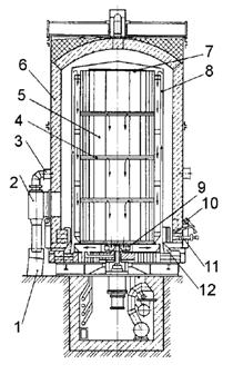 Рис. 1.1 Внешний вид колпаковой печи 1. Вход в дымовой боров. 2. Инжектор. 3. Кольцевой канал сжатого воздуха. 4. Конвекторное кольцо. 5. Рулон 6. Нагревательный колпак. 7. Крышка 8. Двойной муфель 9. Рабочее колесо вентилятора 10. Газопровод 11. Горелка 12. Песочный затвор. Продолжительность подачи в печь максимального количества тепла зависит от равномерности нагрева. При большой неравномерности сокращение подачи топлива приходится начинать еще в тот период, когда садка способна воспринимать тепло и характеризуется невысокой средней температурой. Практика работы показывает, что рациональным значением тепловой мощности следует считать такое, при котором температура муфеля достигает 800-850 0С за 2-3ч. Мощность одностопных печей обычно принимают 17.5-23.5 кВт/т садки. 1.1 Теория термической обработкиОтжиг – процесс термической обработки, обуславливающий получение равновесных (устойчивых) структур распада аустенита во время охлаждения, с определённых температур нагрева в интервале превращений или выше. Отжиг осуществляется путём нагрева стальных листов и рулонов до (или выше) температуры в интервале превращений, продолжительной выдержки при этой температуре и последующего медленного охлаждения. В процессе отжига происходит изменение дисперсных фаз и размера зёрен аустенита; в результате получается равновесная структура феррито–цементной смеси, снижается твёрдость и повышается пластичность и вязкость. Отжиг применяется с целью снятия напряжений, улучшения пластичных свойств, устранения структурной неоднородности. Применяемая термообработка может быть классифицирована следующим образом: а) смягчающий отжиг; б) рекристаллизационный отжиг; в) отпуск. Смягчающий отжиг проводится для разупрочнения горячекатанных листов и заготовок легированных сталей. Сталь после прокатки может иметь различную структуру и различные механические свойства в зависимости от степени деформации, от температуры конца горячей прокатки, от скорости охлаждения и т.п. Поэтому при выборе режима отжига стали после прокатки, кроме химического состава, учитывается также структура и твёрдость стали. Смягчающим отжигом добиваются коагуляции карбидов стали, увеличения размера зерна, снятия н6апряжений и понижение твёрдости. Рекресталлизационный отжиг – процесс термической обработки, обуславливающий исправление искажений кристаллической решётки., полученной при холодном деформировании металла. Рекресталлизационный отжиг осуществляется путём нагрева стали до температуры 150 - 250°С, выше температуры начала роста новых зёрен, образующихся взамен деформированных, выдержки при этой температуре и последующего медленного охлаждения. При рекресталлизационном отжиге происходит рост новых зёрен, образовавшихся взамен легированных, снятие наклёпа и внутренних напряжений при коагуляции цементита и образование зернистого перлита, увеличение пластичности стали, снижение прочностных свойств. Отпуск процесс термической обработки, обуславливающий превращение неустойчивых структур закалённого (полученного в процессе ускоренного охлаждения) состояние в более устойчивые. Отпуск осуществляется путём нагрева металла до температуры ниже интервала превращений, выдержки при этой температуре и последующего охлаждения. В результате отпуска получаются более устойчи