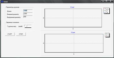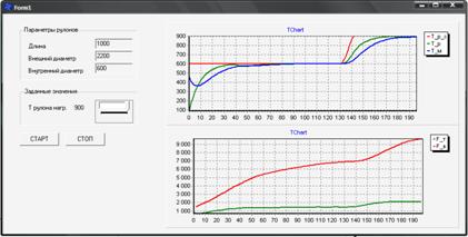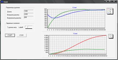 Рисунок В.1 Главное окно программы. В левой части окна расположены управляющие кнопки , поля для ввода значений. При нажатии на кнопку СТАРТ запускается таймер и начинает производится расчет значений температуры рулона, температуры муфеля. Изменение температур выводится на графики. На верхнем графике показаны температурные значения, а на нижнем – значения расхода топлива и воздуха. Ползунком можно менять задание, тогда на графиках становятся видны переходные процессы при ПИД регулировании.