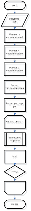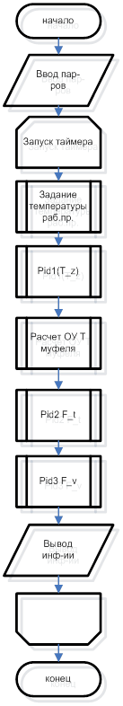 В начале (нулевые) моменты времени управляющие воздействия ПИ-регулятора определяются как и для П-регулятора. 6.3 Блок схема расчетной части задач Структура программы состоит из бесконечного цикла, в котором производится имитация работы контуров регулирования температуры под колпаком печи и регулирования соотношения топливо-воздух. Рис.6.2.1 Блок-схема расчета ПИД-регулятора.