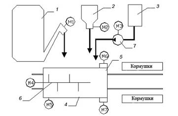Рисунок 1.1 – Технологическая схема линии раздачи корма в свинарнике: 1 — запарник-питатель картофеля; 2 — дозатор-питатель концкормов; 3 — емкость для обрата; 4 — раздатчик-смеситель кормов; 5 — выгрузное устройство; 6 — мешалка; 7 — насос; М5 — привод кормораздатчика (кормораздатчик на рисунке показан в плане). Включается привод смесителя, и происходит одновременная загрузка кормораздатчика-смесителя кормами. После завершения загрузки кормами кормораздатчик перемещается к началу кормушек, и если процесс смешивания завершен, при движении вдоль кормушек производится раздача корма. Если процесс смешивания незавершен, кормораздатчик останавливается до его завершения, а затем происходит раздача. В конце кормушек кормораздатчик останавливается, и с выдержкой времени необходимой для выгрузки остатков корма и снятия инерционности от прямого движения раздатчика включается реверс привода М5, и кормораздатчик возвращается в исходное положение. При раздаче корм выгружается в оба ряда кормушек. 2. Анализ вариантов управления и существующего объема автоматизации технологической линии Технологическая схема может иметь различные варианты реализации и автоматизации управления. Схемы приготовления корма могут иметь различную реализацию, определяемую зональными особенностями и принятой практикой кормления. Приготовление корма может осуществляться как в специализированных кормоцехах, либо может быть сблокировано со свинарником, либо иметь с ним транспортную связь. Раздачу корма на свинокомплексе реализуют по средствам передвижных (мобильных) и стационарных кормораздатчиков. Выбор типа зависит от способа кормления, зональных особенностей, условий содержания свиней, организации работ на ферме и других. Так же возможны два основных типа дозирования: объемный и весовой. Схему управления можно реализовать как на основании релейно-контактной схемы, так и на базе контроллера. В курсовой работе схему реализуем на базе контроллера, что обусловлено следующими факторами: 1 надежность (исключение из схемы большого количества релейно-контактных элементов и регуляторов, что повышает надежность и позволяет проще устранять неполадки (сокращает возможные места их появления)); 2 простота исполнения (удобный и доступный интерфейс контроллера позволяет реализовывать на нем требуемые задачи при минимуме затрачиваемых усилий); 3 возможность мониторинга (контроллер позволяет выполнять контроль и мониторинг, выполняемого процесса в реальном времени); 4 функциональность (в случае изменения технологического процесса (времени срабатывания, задержек, очередности выполняемых процессов, уставок), можно обойтись без внедрения новых элементов схемы, путем перепрограммирования контроллера); 5 экономическая целесообразность (стоимость контроллера при значительных реализуемых схемах, ниже стоимости аппаратуры, используемой без применения контроллера. Во многих случаях, применение контроллеров, не требует наличия постоянного обслуживающего персонала). Таким образом, целесообразность применения контроллера при реализации алгоритма управления обоснована. В целях автоматизации линии раздачи кормов в коровнике, рассмотрим агрегаты, входящие в состав линии: Питатель картофеля, приводящийся в движение электродвигателем АИР90L4 мощностью 2,2 кВт 