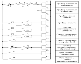 Курсовая работа: Автоматизация линии раздачи кормов в свинарникеКурсовая работа: Автоматизация линии раздачи кормов в свинарникеМИНИСТЕРСТВО СЕЛЬСКОГО ХОЗЯЙСТВА И ПРОДОВОЛЬСТВИЯ РЕСПУБЛИКИ БЕЛАРУСЬ УЧРЕЖДЕНИЕ ОБРАЗОВАНИЯ «БЕЛОРУССКИЙ ГОСУДАРСТВЕННЫЙ АГРАРНЫЙ ТЕХНИЧЕСКИЙ УНИВЕРСИТЕТ» Агроэнергетический факультет Кафедра АСУП Курсовой проект По дисциплине «Автоматизация теплоэнергетических процессов» Тема: «Автоматизация линии раздачи кормов в свинарнике» Минск 2010 Реферат Курсовой проект выполнен в объеме: расчетно-пояснительной запиской на 36 страницах машинописного текста, таблиц – 7, рисунков – 6; графическая часть на 13 листах, в том числе формата А2 – 2, А3 – 4, формата A4 – 7 листов. Ключевые слова: автоматизация, корм, кормораздатчик, смешивание, насос, питатель. В данном проекте произведен анализ вариантов и схем реализации управления линии раздачи кормов на свиноводческих фермах, разработано техническое задание и определен объем автоматизации. По результат анализа был составлен алгоритм и разработана структура управления технологической линией. Так же была разработана полная принципиальная схема, щит автоматики и программа для организации управления посредством контроллера. Курсовой проект оформлен в соответствии с СТБ БАТУ 01.12–06, на текстовом редакторе MS Word 2003, для выполнения графической части применялся графический редактор AutoCAD 2008 автоматизация раздача корм свиноводческая ферма Содержание Введение 1. Описание работы технологической линии 2. Анализ вариантов управления и существующего объема автоматизации технологической линии 3. Техническое задание (требования к схеме управления) 4. Разработка алгоритма управления оборудованием технологической линии 5. Разработка структуры управления в автоматическом режиме работы оборудования 6. Разработка полной принципиальной электрической схемы 7. Выбор средств автоматизации 7.1 Расчет параметров потребителей 7.2 Выбор автоматических выключателей 7.3 Выбор магнитных пускателей 7.4 Выбор тепловых реле 7.5 Выбор промежуточного реле 7.6 Выбор сигнальной арматуры 7.7 Выбор кнопок управления 7.8 Выбор контроллера 7.9 Выбор датчиков 8. Описание работы полной принципиальной электрической схемы 9. Разработка щита автоматики Выводы Литература Введение Автоматизация технологических процессов является одним из решающих факторов повышения производительности и улучшения условий труда. Все существующие и строящиеся промышленные объекты в той или иной степени оснащаются средствами автоматизации. Проектами наиболее сложных производств, предусматривается комплексная автоматизация ряда технологических процессов. Практически все институты, занимающиеся проектированием, ведут разработки проектов автоматизации, а также занимаются подготовкой высококвалифицированных специалистов в этой области. Широкое внедрения средств автоматизации стало возможным только после осуществления комплексной механизации и электрификации сельскохозяйственного производства. В сельском хозяйстве развернута большая организационная и научно - исследовательская работа по созданию систем автоматизации, приборов специфического назначения, которые в ближайшие годы дадут колоссальный экономический эффект. Автоматизация сельскохозяйственного производства повышает надежность и продле