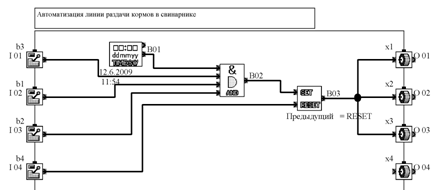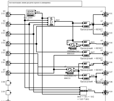 Рисунок 5.4 – Пример программы реализуемой на контроллере Описание структурных блоков программы: Линия запускается по сигналу от элемента TIMESW. В случае срабатывания датчиков (b1, b2, b3) на выходе логического элемента AND формируется логическая единица, которая поступает на вход SET элемента SET/RESET. В результате на выходах O 01…O 03 формируется логическая единица. Как только заполниться смеситель срабатывает датчик b5 и логическая единица со входа O 04 поступает на вход RESET элемента SET/RESET. В результате на выходах O 01…O 03 формируется логический ноль. Аналогичным образом переводим остальные структурные формулы. Полученную программу приводим на рисунке 5.4