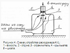 Рисунок 3 - Зависимость расхода масла на долив См от пробега в (для двигателей ЯМЗ-236 и ЯМЗ-238): 1 - при удовлетворительной фильтрации воздуха; 2 - при разгерметизации впускного тракта; Gм = 1,5% - предельное значение расхода масла; S - неиспользованный ресурс двигателя при разгерметизации впускного тракта (при пылевом износе) Все рассмотренные выше методы исследования относятся к методам субъективного диагностирования, наряду с которыми могут быть использованы также методы инструментального (приборного) диагностирования. Так, может быть замерено давление в конце такта Сжатия в цилиндрах двигателя. Оно определяется в абсолютных единицах с помощью компрессометра или в относительных единицах с помощью специальной аппаратуры, фиксирующей изменение силы гока в цепи стартера при прокрутке коленчатого вала в процессе последовательного отключения цилиндров двигателя. Компрессометром замеряется давление сжатия при прокрутке коленчатого вала стартером или в режиме работы двигателя при минимальной частоте холостого хода. Последний вариант испытаний является более предпочтительным, т.к. точность измерения возрастает за счет поддержания определенного скоростного режима двигателя. Величина давления сжатия при nхх= 800 мин для двигателей ЯМЗ должна составлять рс = 3,0-3,5 МПа (30-35 кг/см2) Особое внимание следует обращать на разность давлений рс по цилиндрам. Это сравнение позволит определить цилиндр с дефектными детапями ЦПГ. По замерам значений рс можно определить следующие дефекты деталей ЦПГ: прогар поршня, поломку компрессионного кольца, изношенность деталей, закоксовку колец, задиры поршней и негерметичность клапанов МГР. При указанных дефектах обычно значение рс в цилиндре бывает меньше 2,0-2,1 МПа (20-21 кг/см2). Следующим этапом инструментальной диагностики является осмотр состояния неисправного цилиндра с помощью мотоскопа через отверстие в головке под форсунку. С помощью этого прибора можно определить состояние поршня (наличие разрушений), наличие задиров на поверхности гильзы, уровень износа гильзы по наличию ступеньки на поверхности в зоне останова первого компрессионного кольца в ВМТ и наличие закоксовки колец по следам прорыва газов на гильзе. Здесь же можно оценить состояние клапанов, т.е. определить наличие трещин и прогаров, величину отложений на них. При наличии соответствующих расходомеров на двигателях можно определить расход картерных газов QКГ, который позволяет судить о состоянии деталей ЦПГ и МГР. На рис. 4 показана принципиальная схема расходомера фирмы AVL (Австрия).