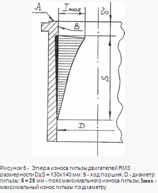 Принцип работы расходомера АVL основан на том, что высота подъёма крыльчатки 4 в выходном патрубке ёмкости 1 будет пропорциональна расходу картерных газов двигателя, значение которого определяется по шкале 5. По значению Qкг невозможно (так же как и по значению рс) однозначно оценить состояние деталей ЦПГ, т.к. значения изменяются в достаточно широком диапазоне как на новых, так и на изношенных двигателях. Однако установлено, что на двигателях ЯМЗ при значениях Qкг > 1.4 м3 /цил-ч имеют место дефекты деталей ЦПГ, указанные выше. Дополнительную информацию о состоянии деталей ЦПГ можно получить с помощью физико-химического и спектрального анализов картерного масла. После съёма головки необходимо провернуть коленчатый вал для проверки утопания поршней в положении ВМТ относительно верхнего бурта гильз (поверхность А на рис. 5). Чрезмерное утопание одного или нескольких поршней свидетельствует об изгибе шатуна в цилиндрах из-за дефектов, приведших к попаданию постороннего предмета или охлаждающей жидкости в камеру сгорания. Необходимо осмотреть днища поршней для того, чтобы определить, происходит ли контактирование поршней с клапанами (по отпечатку клапанов на днищах поршней), попадание постороннего предмета в камеру сгорания, есть ли обгорання и трещины на кромках камеры сгорания. На рабочих поверхностях гильз необходимо отметить возможные надиры, задиры и тёмные пятна, свидетельствующие о прорыве газов в камеру сгорания из-за зависания или поломки поршневых колец. Коррозия на зеркале гильз свидетельствует о попадании охлаждающей жидкости в цилиндры или о длительной стоянке неработающего двигателя, приведшей к конденсации паров жидкости на рабочих поверхностях гильз. По величине "ступеньки" в зоне останова первого компрессионного кольца в ВМТ необходимо определить величину максимального износа гильзы Imax по диаметру D относительно верхней неработающей поверхности гильзы (поверхность В на рис. 5). Допустимый износ гильзы по диаметру для двигателей ЯМЗ равен 0,20-0,25 мм. Замер износа гильзы в составе двигателя и после её извлечения из блока производится нутрометром.