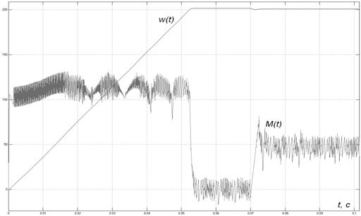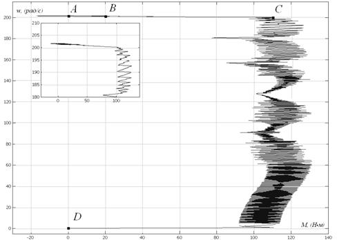 Рис. 7.2 Она получается из временных зависимостей М(t) и w(t) путем исключения из них времени t. При разгоне ЭД годограф вектора электромеханической характеристики проходит последовательно через точки D, C и достигает точки А. Характеристика наглядно показывает динамику разгона двигателя. Также видно, что скорость устанавливается без перерегулирования на уровне расчетного значения. Чтобы показать астатический характер РЭП, т.е. абсолютную жесткость электромеханической характеристики (неизменность скорости при изменении нагрузки), система была нагружена моментом сопротивления Мс=47, Нм через 0,07с после начала разгона (рис. 7.1). Из-за появления тока, обусловленного нагрузкой, в контуре тока возникает небольшое перерегулирование, что, тем не менее, не сказывается ощутимо на просадке скорости (рис.7.2). Годограф вектора переходит из точки А в точку В. Очевидно, что точки А, В, С лежат на одном уровне, параллельном оси абсцисс и равном расчетному значению скорости.