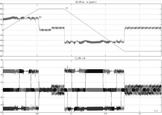 Рис. 7.7 Регулятор скорости не заходит в ограничение. Скорость ротора устанавливается без перерегулирования, ток не достигает своего максимального значения. Наличие высших гармоник, наложенных на основные измеряемые координаты связано дискретными сигналами управления релейного регулятора тока. 8. Бездатчиковое определение скорости вентильного двигателяВ большинстве приложений, где необходимо получение хороших характеристик электропривода при минимальной его стоимости, наибольший интерес вызывают схемы бездатчикового векторного управления. Прежде всего - это атомная энергетика, в частности, перегрузочные роботы, где необходим более высокий (до 50:1) диапазон регулирования скорости и по условиям технологии исключается возможность установки датчика положения на вал ротора двигателя. К подобным системам управления (СУ) предъявляются также повышенные требования по диапазону регулирования электромагнитного момента - до 10:1. Применительно