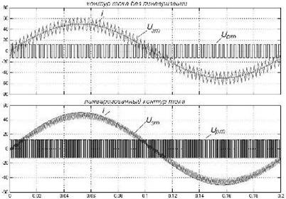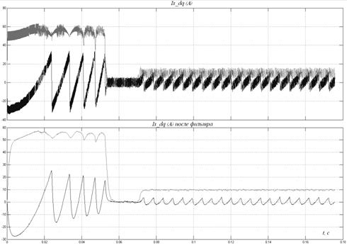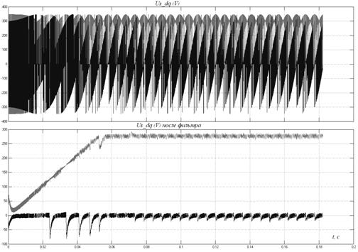 Рис. 8.3 На рис. 8.4 изображены напряжения и токи статора двигателя в неподвижной системе координат после фильтрации высоких частот.