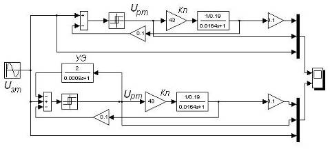 вывод, что постоянная времени ускоряющего элемента Следует отметить, что увеличение коэффициента передачи ускоряющего элемента также увеличивает частоту автоколебаний, одновременно смещая фазу выходного сигнала в сторону отставания. Результирующий коэффициент передачи линейной части контура тока при этом уменьшается. На рис. 4.6 приведена структурная схема линеаризованного контура тока. Для сравнения на осциллограф выведены сигналы контура тока без линеаризации (рис. 4.7).