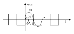 Физический смысл выражения (4.1) состоит в том, что результирующая частотная характеристика представляется в виде суммы простейших характеристик, кратных нечетным частотам. Это вытекает из того, что выходной сигнал релейного элемента, имеющий прямоугольную форму, раскладывается в бесконечную сумму ряда Фурье с нечетными гармониками (рис. 4.2.).