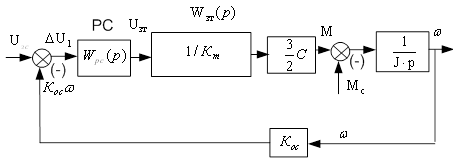 где Регулятор скорости (РС) примем пропорционально-интегральным («ПИ»), наш РЭП примет астатический характер. Зададимся передаточной функцией разомкнутой системы типа «2-1»:
