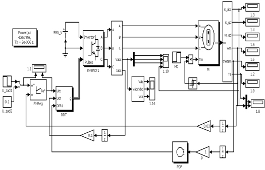 Рис. 5.2 6. Моделирование вентильного двигателяНа рис. 6.1 приведена виртуальная модель РЭП синхронной машины, включенной по схеме вентильного двигателя, составленная в пакете Matlab 6.5.