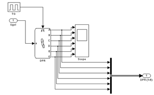 Рис. 6.2 электропривод вентильный двигатель Входной величиной для ПДФ является угол поворота вала двигателя, а выходным сигналом – вектор из шести единичных импульсов, сдвинутых друг относительно друга на 60 градусов (рис. 6.4). Это дает имитацию шести сигналов от чувствительных элементов, расположенных равномерно вдоль окружности и вырабатывающих импульсы в соответствии с пространственным расположением ротора. Так как ДПР реализован в виде конечного автомата, то для его работы необходим тактовый сигнал, который подается тактового генератора TG. Рассмотрим внутреннюю структуру датчика положения ротора (DPR). Следует отметить, что ДПР реализован с помощью пакета моделирования Stateflow, который хорошо интегрируется с Simulink и входит в стандартный набор пакетов Matlab. Пакет Stateflow задуман и предназначен для моделирования сложных систем управления с возможностью ветвления и образованием циклов [18]. Пакет оперирует событиями методом конечных автоматов. Автомат представляет собой звено, осуществляющее преобразование вектора входных переменных XIN в вектор выходных переменных XOUT. В пакете Stateflow автомат представляется в виде графа, в нашем примере граф представлен алгоритмом ДПР [6]. Более подробно о работе пакета Stateflow можно узнать на сайте разработчика Matlab или на русскоязычном форуме Matlab [19]. Достоинством этого способа реализации датчика положения является компактность схемы, простота реализации, прозрачность алгоритма, малая вычислительна нагрузка на ЭВМ. Дополнительное преимущество еще и в том, что алгоритм, реализованный в графе автомата, преобразуется в программный код языка высокого уровня (язык С), что окажется полезным при разработке алгоритма вычисления скорости, дискретного регулятора положения и скорости. Автомат, представленный