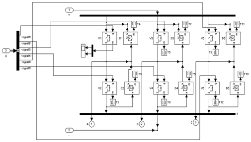 Рис. 6.6 Диаграмма переключения ключей инвертора соответствует алгоритму коммутации коллектора двигателя постоянного тока. Разрешающие сигналы переключения ключей умножаются с напряжением задания тока и поступают на один из входов релейного регулятора. На второй вход поступают токи обратной связи. 6.3 Инвертор напряженияНа рис. 6.7 представлена структурная схема и нумерация ключей инвертора напряжения.