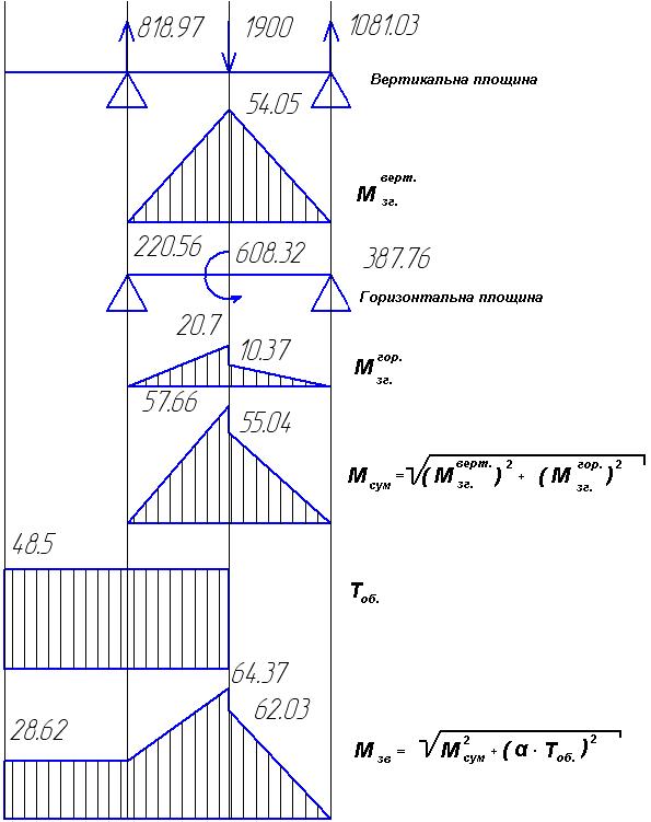 Коефіцієнт a ураховує різниці в характеристиках циклів навантажень. Визначаємо сумарні згинальні моменти у характерних точках і сумарні радіальні реакції опор вала за формулами :