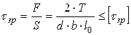 обертовий момент, d – діаметр вала, мм; l0 – робоча довжина шпонки, мм, для призматичної шпонки з округленими кінцями l0 = l - b, а для шпонки з плоскими торцями l0 = l; h – висота шпонки, мм; t1 – глибина паза на валу, мм;